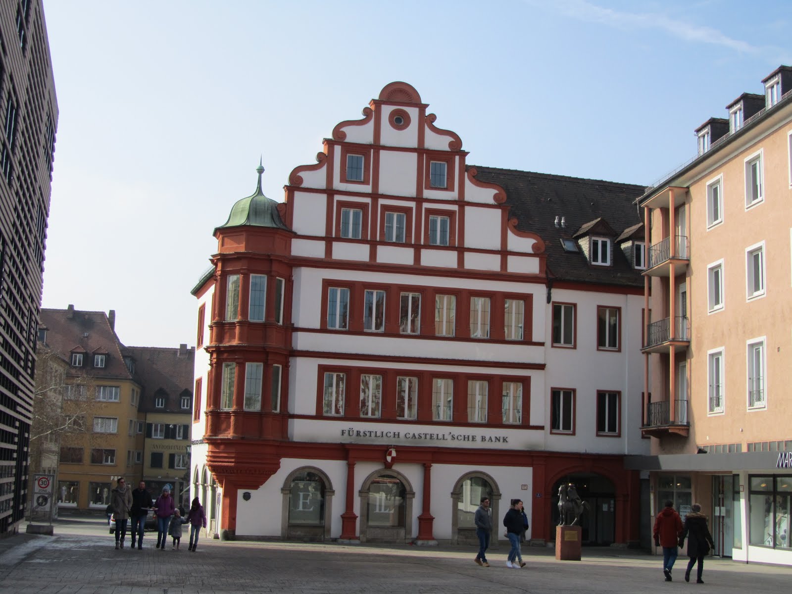 The first interesting object - a building of a local bank. But what actually drew my attention was this nice horse nearby. It is a memorial to a kind of deliverer or postman. The message on the table is "many good news to the citizens of Würzburg!".